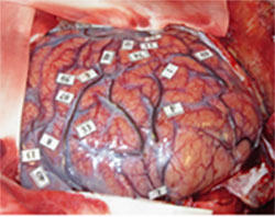Le cerveau étant parfaitement indolore, la chirurgie est réalisée sous anesthésie locale. Le patient effectue des tests sur la table d’opération, par exemples : bouger le bras, compter, parler etc. Dans le même temps, le neurochirurgien applique à la surface du cerveau une stimulation qui va perturber transitoirement (quelques secondes) et de façon très localisée (quelques millimètres) le fonctionnement cérébral (Figure 1). Ceci permet de localiser avec exactitude les fonctions du cerveau (Figure 2) et donc de retirer la tumeur avec le maximum de sécurité.
